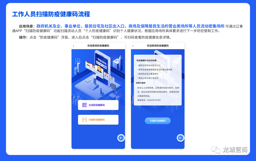 應(yīng)用場(chǎng)景:政府機(jī)關(guān)及企、事業(yè)單位,居民住宅及社區(qū)出入口,商場(chǎng)及保障居民生活的經(jīng)營(yíng)類場(chǎng)所等人員流動(dòng)密集場(chǎng)所可通過(guò)遼事通APP“掃描防疫健康碼”功能掃描流動(dòng)人員“個(gè)人防疫健康碼”識(shí)別個(gè)人健康狀況,根據(jù)應(yīng)用場(chǎng)所具體要求進(jìn)行下一步防控管制工作。